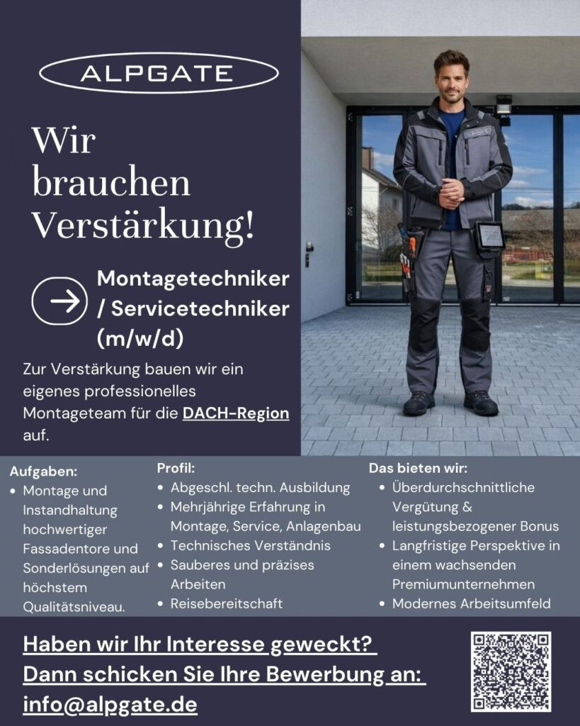 ALPGATE wächst und braucht Verstärkung. Für die Erweiterung unseres Teams bauen wir ein eigenes professionelles Montageteam für die DACH-Region auf.