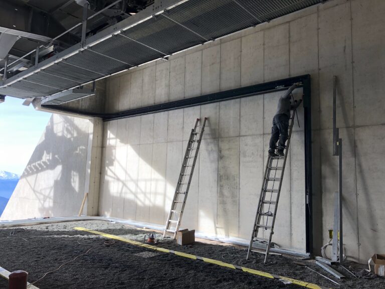 Die obentragenden Rundlaufschiebetore mit den Abmessungen 6050mm x 4125mm (BxH) wurden mit Sandwich-Blechpaneelen gefüllt und beidseitig in RAL9005 matt beschichtet. Jeweils im Durchlassbereich der Seilbahn wurden die Torlaufschienen auf einer Breite von ca. 1250mm unterbrochen. Die beiden Toranlagen wurden zusätzlich mit einer selbstregulierenden Schienenbegleitheizung ausgeführt, um den reibungslosen Lauf auch bei extremen Witterungsbedingungen zu gewährleisten.
