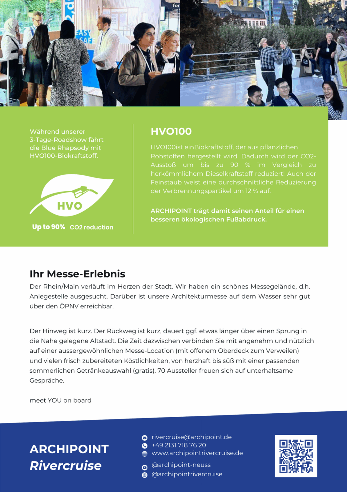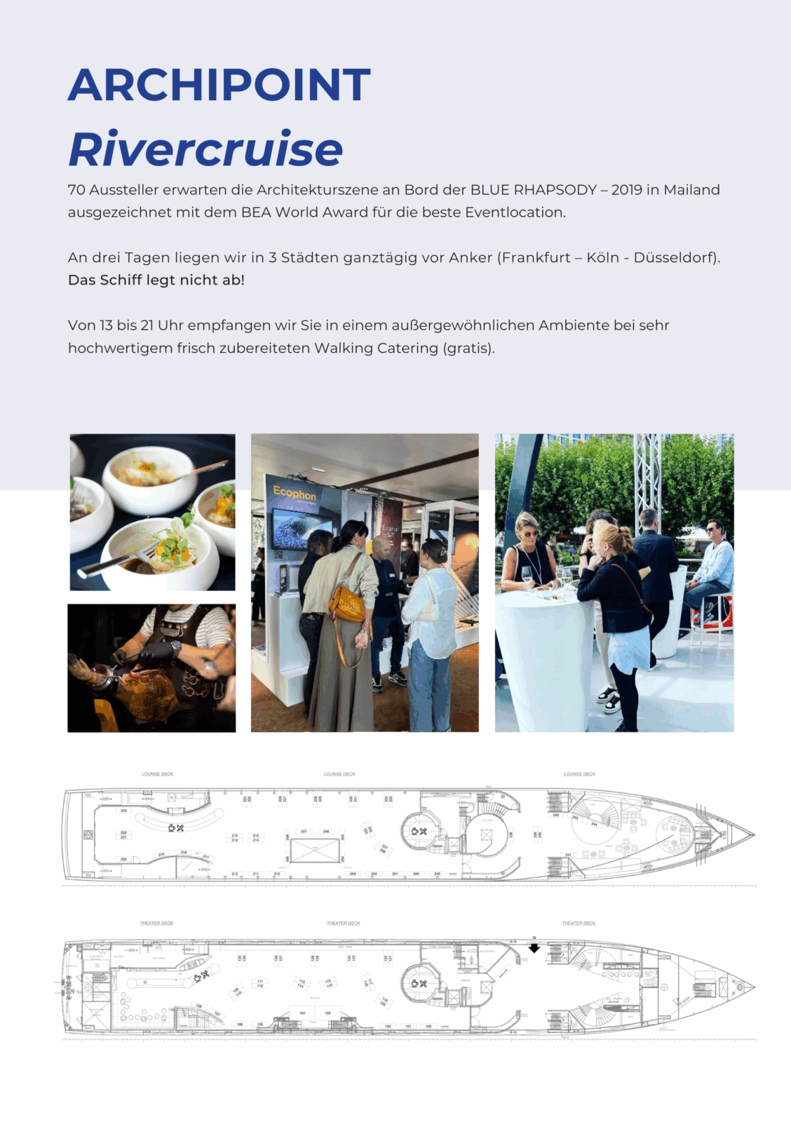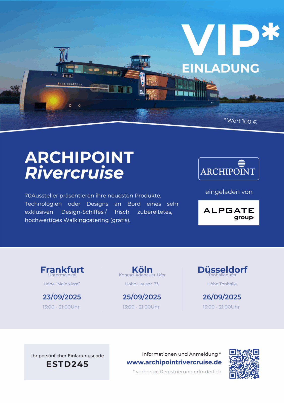 Ce salon itinérant/fluvial est organisé exclusivement pour les professionnels de l’architecture et de la construction, notamment les cabinets d’architectes, les promoteurs immobiliers, les entreprises de design et spécialisées, les entreprises générales, les distributeurs, les ingénieurs, les architectes d’intérieur et les agenceurs, les investisseurs, les planificateurs, les développeurs de projets ainsi que les villes et les communes. Une visite coûte 100,00 EUR, mais grâce à votre code d’inscription personnel, vous pouvez monter à bord gratuitement.